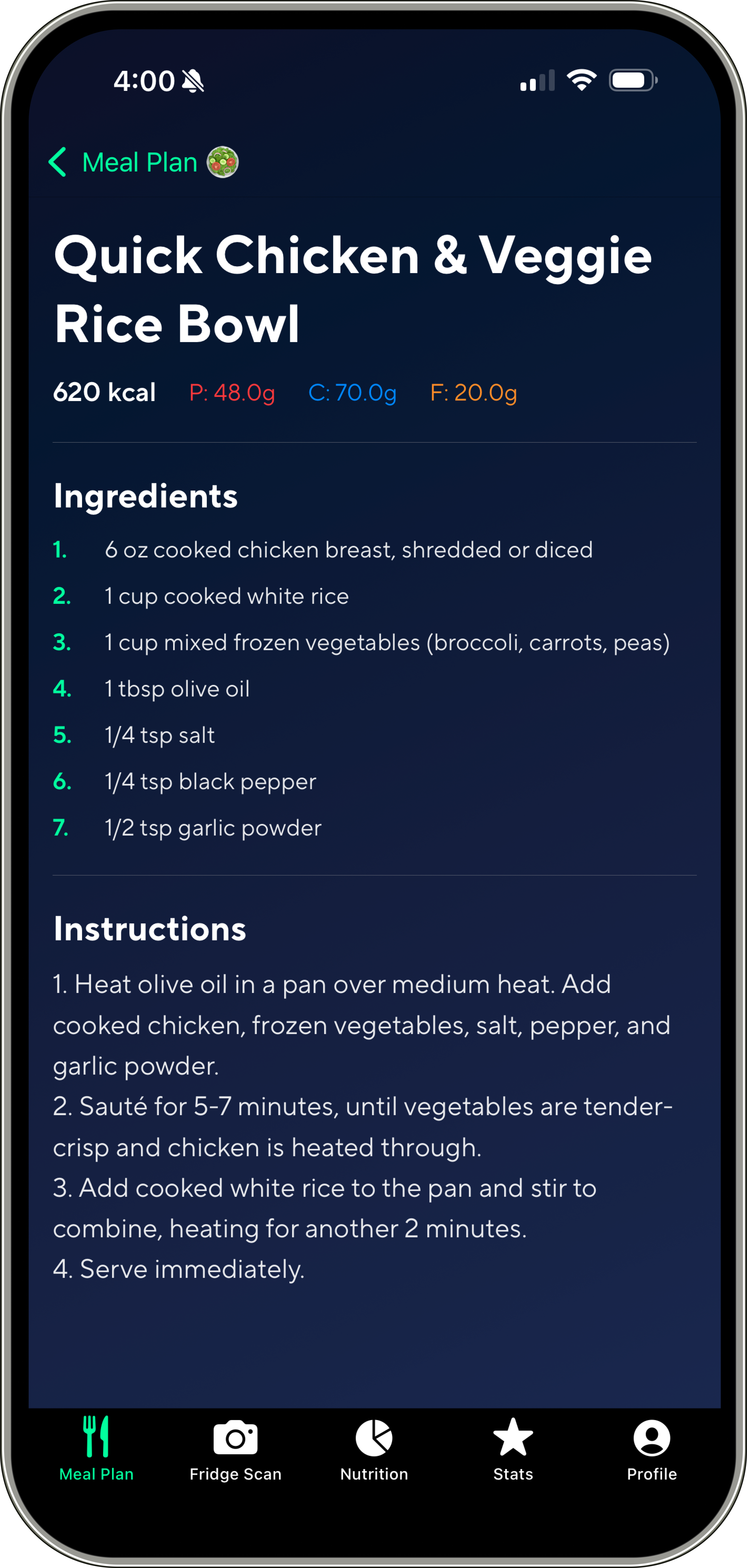 Get personalized weekly meal plans, automatic macro tracking, and progress insights—all tailored to your body, goals, and lifestyle. No more meal prep stress. No more macro math. Just results.